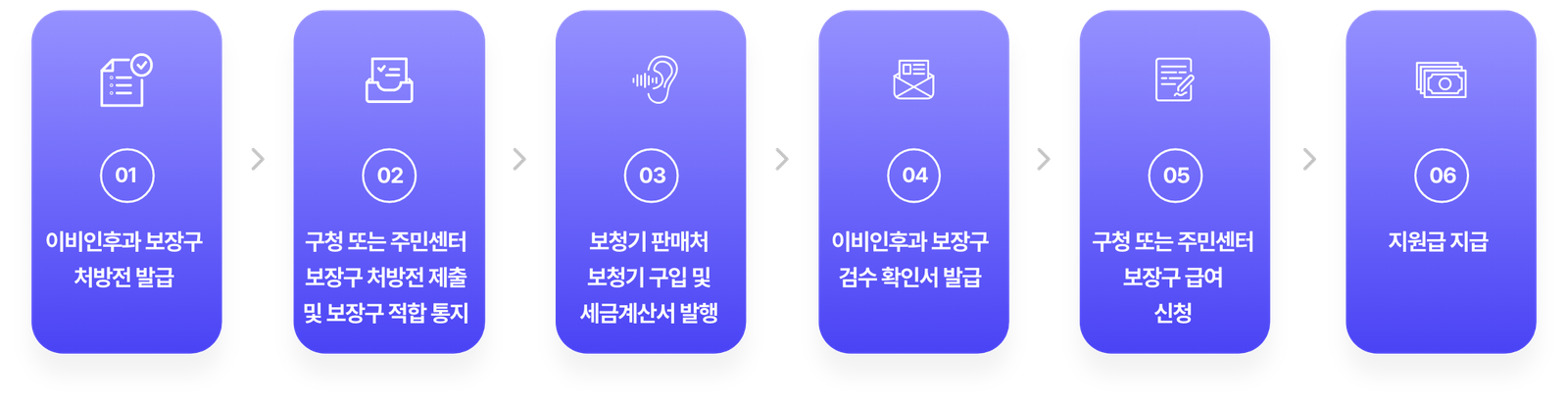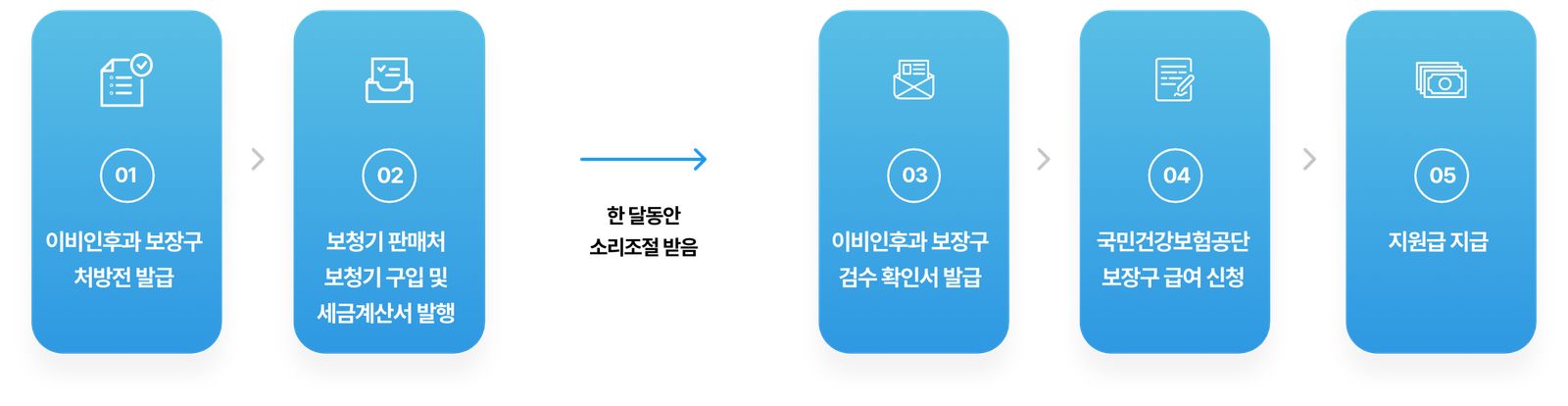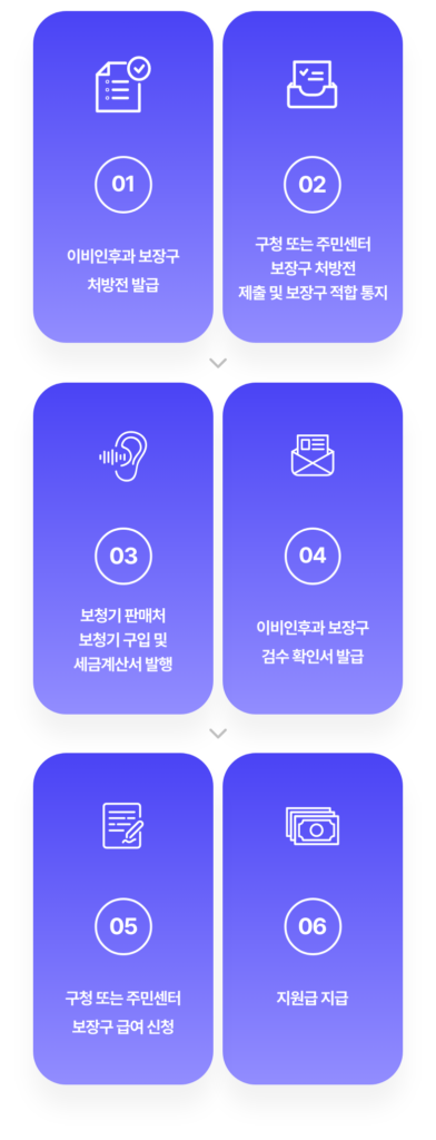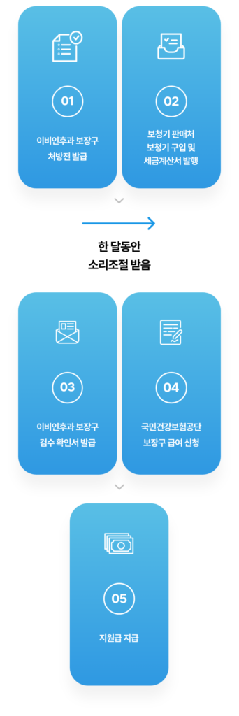 보장구 처방전, 보청기 구입 세금계산서(영수증), 보장구 검수 확인서, 복지카드, 본인 명의 통장 사본을 지참하고 국민건강보험공단에 방문하여 보장구 급여 신청서를 제출합니다.
