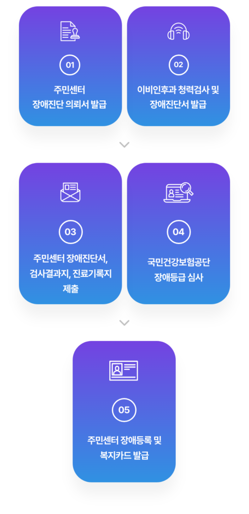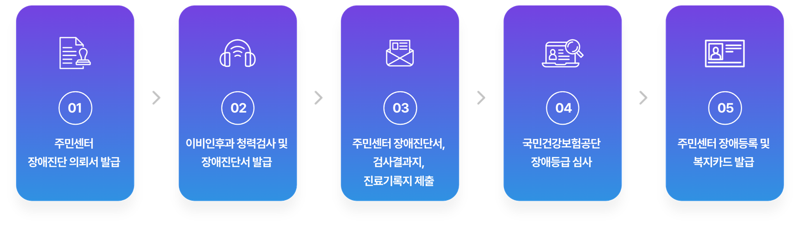 이비인후과에서 장애진단서, 검사결과지, 진료기록지를 발급받아 주민센터에 제출합니다.
